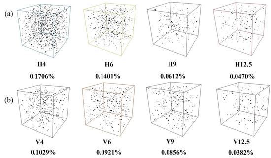 XCT reconstructions (500 px × 500 px × 500 px) and void density of the samples manufactured in (a) horizontal and (b) vertical orientations.