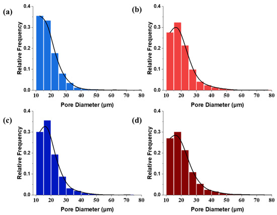 Graphs representing the pore diameters vs. relative frequency for the L-PBF specimens (a) H4 (b) H12.5 (c) V4 and (d) V12.5.