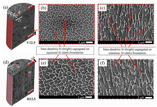 Some variability in the microstructure depending on the build orientation was detected with comparing the 12.5 mm samples (Figure 4). Perpendicular to the build direction, the vertical samples showed the distinctive α-Al matrix with a continuous eutectic Si network (Figure 4b) which was discontinuous in the case of the horizontal specimen (Figure 4e). Additionally, the horizontal samples had relatively slightly coarser cells. The reason behind this difference can be attributed to the fact that these samples remained on the heated platform for longer, i.e., until the manufacture of the full height of the vertical samples was completed. It is envisaged that the elevated temperature of the build plate led to an in-situ heat treatment that stimulated some decomposition of the inter-dendritic Si and its diffusion within the α-Al matrix, thereby disrupting the eutectic Si network [44,45].