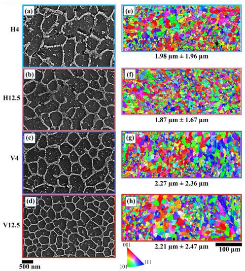 The effect of varying the sample size for a fixed orientation on the microstructure (i.e., H4 vs. H12.5, and V4 vs. V12.5) can be seen in Figure 5a–d. No significant difference was observed in the morphology or size of the Al cells. Interestingly, for smaller samples (<5 mm) in the literature [23] a variability in the average cell size (0.75 to 1.75 μm) and coarseness was reported with the increase in feature size from 1 mm to 5 mm, respectively. In Takata et al. [24], however, there was no discernible effect for the size (>5 mm) on the microstructure. This was further supported by the quantitative assessment of the grain size from the IPF maps of the EBSD scans on the plane perpendicular to the build direction in our study, as shown in Figure 5e–h. The maps cover multiple melt pools within the cross-section, typically revealing more refined equiaxed grains along the melt pool boundaries, in agreement with the literature [46]. The variation in cell sizes within the melt pool, represented by the corresponding IPF maps, was also evident by the standard deviation reported with the average grain size. No significant correlation was observed between the grain size and the sample size. Furthermore, there was no evidence of crystallographic texture variation with size. The formation of the sub-grain cellular structure, evaluated qualitatively using electron microscopy (Figure 5a–d) and quantitively through the average grain diameters from the IPF maps (Figure 5e–h), did not change with the size of the specimen. Based on these results, it was concluded that the “size-effect” was not significant enough to alter the microstructure in the size range investigated in this study.