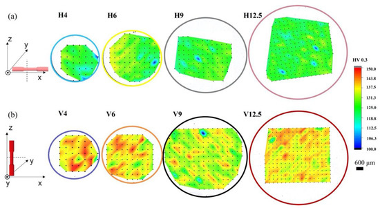 Colour contour maps representing Vickers micro-hardness (HV) values of the cross-sections (planes perpendicular to the tensile loading direction) of the specimens with various size parameters, oriented (a) Horizontally and (b) Vertically in the AM build. Black marks represent the indents on the respective samples.