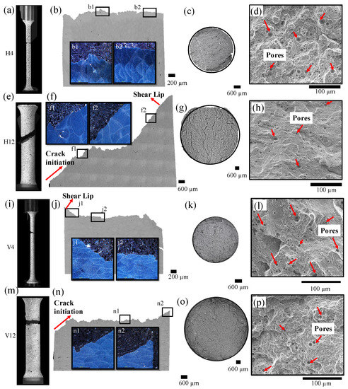 Findings from the tensile tests were supplemented with fractography analysis. The horizontal samples (e.g., H4 and H12.5) failed in two distinctive modes, as per Figure 7a,e, respectively. The fracture plane in the 4 mm specimen was flat and perpendicular to the loading direction (i.e., parallel to the build direction). Conversely, the fracture plane for the 12.5 mm sample was inclined to the specimen’s longitudinal axis by 45°, indicating failure primarily through plastic flow in the direction of the maximum shear stress [52]. This discrepancy was further visualized by the cross-sectional views of the corresponding fracture surfaces in Figure 7b,f, showing the distinctive orientation of the crack propagation path with respect to the melt pools. The insets in Figure 7b,f reveal the microstructural features identifiable along the boundaries of the fracture surfaces. Regardless of the sample size, the crack propagated by shearing through the cores of the melt pools (Figure 7b) and scan tracks (Figure 7f). Although the topography of the fracture surfaces observed by OM did not reveal significant differences between H4 and H12.5, high magnification SEM images indicated a higher presence of shallow pores in H4 (Figure 7c,d,g,h). This observation is in-line with the XCT results, where porosity showed an inverse relationship with the gauge diameter.