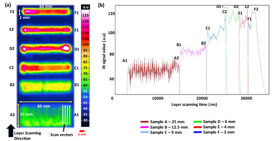 (a) Heat map representing the maximum value of each pixel of the thermal image in the selected region of interest. The rectangular cross-sections with fixed length (60 mm) and varying widths (25 mm, 12.5 mm, 4 mm and 2 mm) were scanned sequentially by the laser in a single layer. (b) IR-signal-time-plots with different line colours indicating the samples with varying widths. The data are clipped at 130 a.u. because of the limitation of the blackbody calibration range chosen. The time stamp starts at the beginning of capturing the signal (t = 0) and not at the beginning of laser scanning.
