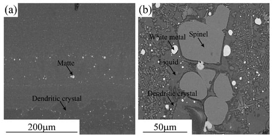 Typical microstructures of the quenched smelting and converting slags: (a) Smelting slag and (b) Converting slag.