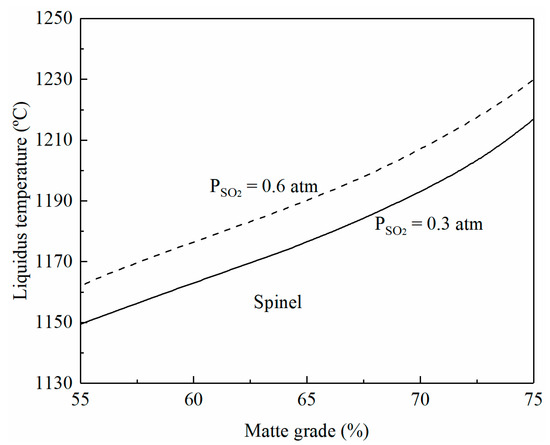 The liquidus temperature of a smelting slag is directly related to its composition and oxygen partial pressure, which determines the FeO/Fe2O3 ratio in the slag [21]. The oxygen partial pressure in the system cannot be measured directly but correlates to the matte grade, SO2 partial pressure, and temperature [22,23]. The matte grade in the smelting process can be controlled by the composition of copper concentrate and the ratio of oxygen to the concentrate. The SO2 partial pressure in the off-gas is determined by the oxygen enrichment in the input gas mixture. Figure 2 shows the effect of matte grade and SO2 partial pressure on the liquidus temperature of the smelting slag whose composition is based on Table 1. FactSage calculations show that the composition of the smelting slag shown in Figure 2 is in the spinel primary phase field. It can be seen that the liquidus temperatures of the smelting slag increase with the increasing matte grade and SO2 partial pressure. At low-oxygen enrichment, PSO2 is approximately 0.3 atm. It can be seen from Figure 2 that the liquidus temperature increases from 1150 to 1215 °C when the matte grade is increased from 55 to 75. On the other hand, the liquidus temperature can be increased by approximately 12 °C when PSO2 is increased from 0.3 to 0.6 atm at a fixed matte grade.