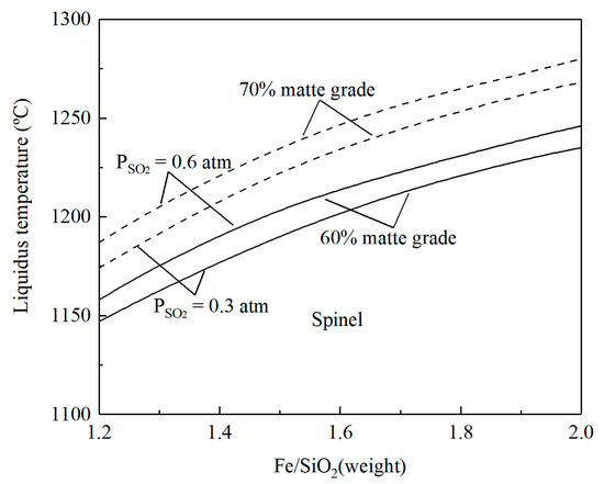 SiO2 is usually added as a flux in the copper smelting process, and the Fe/SiO2 ratio can represent the composition of a copper smelting slag. It can be seen from Figure 3 that at fixed matte grade and PSO2, the liquidus temperatures of a copper smelting slag increase with an increasing Fe/SiO2 ratio, i.e., with a decreasing SiO2 addition. At a fixed operating temperature and production of high-grade matte or high-SO2 off-gas, more SiO2 flux needs to be added to keep the liquidus temperature below the operating temperature. The slope of the liquidus temperature is decreased with the increase in Fe/SiO2. For example, the temperature increase is 30 °C when the Fe/SiO2 ratio increases from 1.3 to 1.5. When the Fe/SiO2 ratio is increased from 1.5 to 1.7, the increment of the liquidus temperature is only 20 °C at SO2 partial pressure 0.6 atm and matte grade 70%.