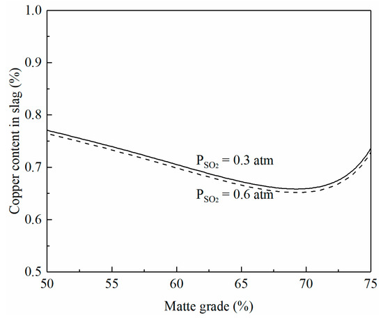 The microstructure of the quenched flash smelting slag shown in Figure 1a indicates that the copper in the smelting slag is present as dissolved copper. The effects of matte grade on copper content in the smelting slag are predicted by FactSage 8.2 and shown in Figure 4. The copper content in smelting slag decreases with the increasing matte grade up to 70% Cu. With a matte grade greater than 70%, the copper content in the slag increases with the increasing matte grade. This trend is confirmed by the experimental studies of Fallah-Mehrjardi et al. [24,25] but is different from the findings reported by Shimpo et al. [26]. There is a general understanding [27] that the sulfidic dissolution of copper in copper smelting decreases with the increasing matte grade. However, the oxidic dissolution of copper in the slag increases with the increasing matte grade. As a result, the copper content in the smelting slag is not a simple function of the matte grade. A total of 70% Cu in the matte seems to be the optimum grade to reduce the copper loss in the slag to 0.65%. It can be seen from the figure that SO2 partial pressure has little effect on the copper content in the slag. This is a good indication that increased oxygen enrichment does not increase the copper content in the smelting slag.