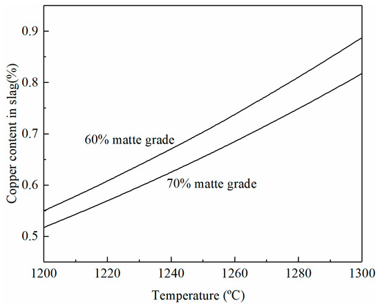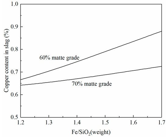 Figure 6 shows the copper content in the smelting slag as a function of the Fe/SiO2 ratio in the slag. It can be seen that copper content in the smelting slag increases with the increasing Fe/SiO2 ratio in the slag. However, the increment is different at different matte grades. When 70% matte is produced, the copper content in the slag increases slowly with the increasing Fe/SiO2 ratio in the slag. An increase in the Fe/SiO2 ratio from 1.2 to 1.7 only increases the copper content in slag by 0.05%. In contrast, an increase in the Fe/SiO2 ratio from 1.2 to 1.7 can increase the copper content in slag by 0.2% with 60% matte production. The increase in Fe/SiO2 means a decrease in SiO2 addition and slag volume. Copper loss in the slag needs to consider both Cu% in the slag and slag volume. The selection of the Fe/SiO2 ratio in the copper smelting slag needs to balance liquidus temperature, copper content in slag, and slag volume.