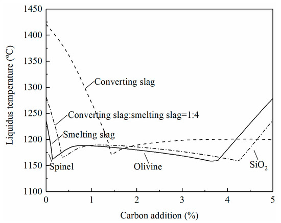 At high temperature reduction, the oxides of copper, molybdenum, zinc, nickel, iron, and tin in the smelting and converting slags can be reduced with carbon addition. The liquidus temperatures of the slag will change accordingly with the reduction. The effect of carbon addition on liquidus temperatures when treating individual slag or mixed slags (80% smelting slag and 20% converting slag) is shown in Figure 7. It can be seen that spinel is the primary phase at low carbon addition and the liquidus temperatures decrease with increasing the carbon percentage. More carbon addition brings the slags to the olivine primary phase field where the liquidus temperatures are lower than 1200 °C. The smelting slag enters into the SiO2 primary phase field with further addition of carbon. The liquidus temperatures rapidly increase with the increasing carbon in the SiO2 primary phase field. In a copper smelter, the ratio of the smelting slag to converting slag is approximately 4:1. It can be seen from Figure 7 that treatment of the mixed smelting and converting slags is possible. The liquidus temperatures can be controlled below 1200 °C without flux addition.