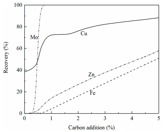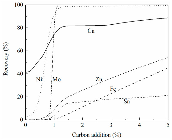 The effect of carbon addition on the recovery of copper, iron, zinc, and molybdenum from the smelting slag at 1250 °C is shown in Figure 8. It can be seen that copper is first reduced followed by molybdenum. With less than 1% carbon addition, 100% molybdenum oxide has been reduced. When 5% carbon is added, the recovery of copper, zinc, and iron is 88%, 58%, and 51%, respectively. It can be seen from Figure 7 that the liquidus temperature is above 1250 °C when 5% carbon is added to the smelting slag. To add more carbon to increase the recovery of copper and zinc, flux such as CaO needs to be added to lower the liquidus temperature of the slag.
