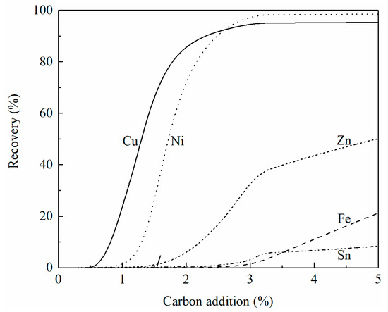 Effect of carbon addition on the recovery of copper, iron, zinc, nickel, and tin in converting slag at 1250 °C, calculated by FactSage 8.2.