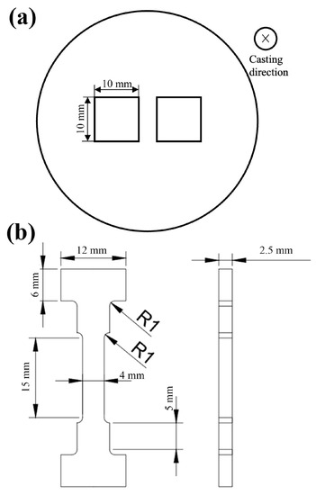 (a) Schematic diagram of sampling position and (b) dimension diagram of tensile specimen.