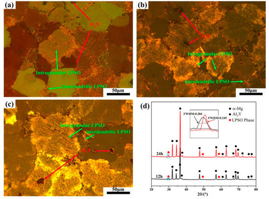 Figure 3 shows the OM image and XRD patterns of Mg-1Al-12Y alloy after solution treatment at 450 °C at different times. From Figure 3d, it can be found that the diffraction peak of the LPSO phase appears in the spectrum of the solution-treated alloy, while the diffraction peak of the β-Mg24Y5 phase existing in the as-cast alloy disappears in the XRD pattern of the solution-treated alloy, which is due to the melting point of β-Mg24Y5 phase is lower, about 605 °C [12]. A blue rectangle marked the LPSO diffraction peak. It can be found from the local magnification that the diffraction peak width at half maximum of the LPSO phase of the alloy after 24 h solution treatment is 0.039° lower than that of the alloy after 12 h solution treatment. The relative intensity increases significantly, indicating that the content and size of the LPSO phase are increasing and growing. As shown in Figure 3a–c), under the polarizing mode of the optical microscope, it can be found that the alloy precipitates a large amount of gold intragranular layered LPSO phase and a small amount of interdendritic LPSO phase. The massive particles in the alloy are the Al2Y phase, which is randomly distributed on the grain boundaries and within the grains of the alloy. It can be found that the number of grains with LPSO phase precipitation also increases with the prolongation of the solution time, and the size of the LPSO phase precipitated in the alloy also increases with the prolongation of the solution time. Figure 4 shows the line chart of grain size of as-cast alloy and solid solution alloys calculated by the software of Nano Measure. It was found that the grain size of the alloy did not change significantly after solution treatment.