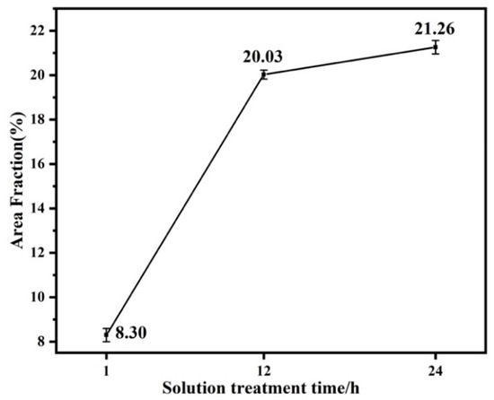 The area fraction broken line diagram of the LPSO phase of the alloy after solution treatment at 450 °C for 1 h, 12 h and 24 h is shown in Figure 5 according to the statistics of Image Pro Plus software. It is found that with the prolongation of solution treatment time, the area fraction of the LPSO phase precipitated inside the alloy particles increased, which were 8.30%, 20.03% and 21.26%, respectively. This is the same conclusion drawn from the metallographic and XRD patterns shown in Figure 3.