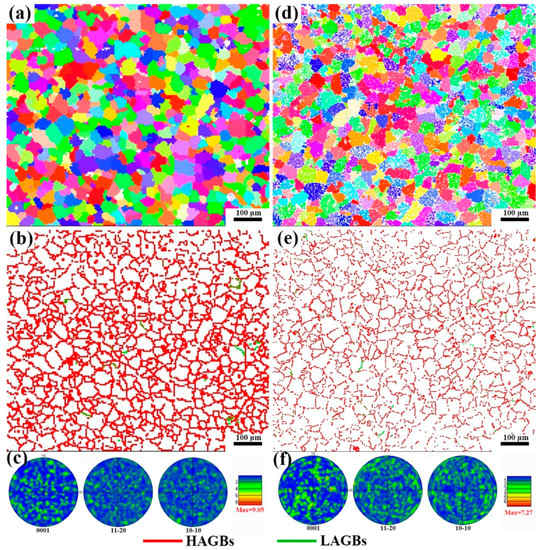 IPF image, grain boundary image and pole figure of as-cast alloy (a–c) and alloy after solution treatment for 12 h (d–f).