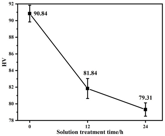 After solution treatment at 450 °C, alloys with different LPSO contents were obtained, and then the hardness and tensile tests were carried out on the alloys with different LPSO contents. Figure 8 presents the Vickers hardness of the as-cast alloy and the solution-treated alloy. It can be found that the Vickers hardness decreases with the prolongation of solution treatment time. The reason why the Vickers hardness of the alloy after solution treatment is significantly lower than that of the as-cast alloy is that the network β-Mg24Y5 phase in the as-cast alloy disappears with the solution treatment. In addition, with the increase in the LPSO phase precipitated in the solid solution alloy, the hardness of the alloy also tends to decrease. It shows that the increase in the LPSO phase precipitation area fraction can effectively improve the mechanical properties of the alloy [29].