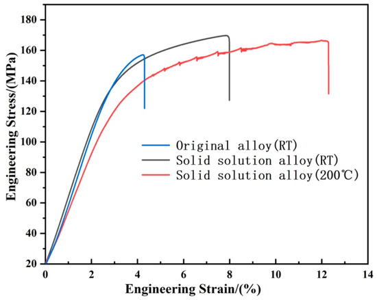 Figure 9 indicates the engineering stress–strain curve of the as-cast alloy stretched at room temperature (Alloy A), the alloy stretched at room temperature after solution treatment at 450 °C for 12 h (Alloy B) and the alloy stretched at 200 °C after solution treatment at 450 °C for 12 h (Alloy C). The corresponding mechanical properties are summarized in Table 1. It can be found that the UTS, TYS and EL of the as-cast alloy at room temperature are 156.99 MPa, 133.45 MPa and 4.2%, respectively. Comparing the mechanical properties of the solid solution alloy and the as-cast alloy, it is found that UTS and EL increased by 7.8% and 85.7%, respectively, while TYS only decreased by 3.9%, and the comprehensive mechanical properties improved. Compared with room temperature, the mechanical properties of solid solution alloys at elevated temperatures decreased by only 9.9% and 1.78% for TYS and UTS, while EL increased by 58.9%. This suggests that solid solution alloy has good high-temperature stability. The serrated flow characteristics can be observed in the Alloy C curve, which may be caused by the Portevin-Le Chatelier (PLC) effect of Alloy C during stretching [30].