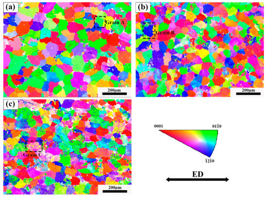 The IPF image of the three tensile samples is shown in Figure 11. It is found that the alloy grains after tension have no preferred orientation. Due to the formation of a large number of dispersed lamellar LPSO phases inside the grains of Alloy B, the TYS of Alloy B is theoretically higher than that of Alloy A. However, the TYS of Alloy B and Alloy C are lower than Alloy A in the experimental results, while the UTS and ductility have greatly improved. Since the α-Mg/LPSO phase interface hinders the movement of dislocations, stress concentration and uncoordinated strain occur in Alloy B and Alloy C, resulting in a decrease in the TYS of Alloy B and Alloy C. The Schmid factor (SF) distributions of the basal slip for the three tensile samples are shown in Figure 12. Typically, basal <a> slip is more easily activated with higher mean SF values, resulting in lower yield strength and higher ductility, and vice versa [34]. In this paper, the average SF value of Alloy B is higher than that of Alloy A, so Alloy B has a comparatively lower yield strength and higher ductility. However, the average SF value of Alloy C is slightly lower than that of Alloy A and Alloy B. Namely, Alloy C should have higher yield strength and ductility, which is contrary to the experimental results. Therefore, in addition to the second phase and basal <a> slip, other factors affect the ductility of solid solution alloys at elevated temperatures.
