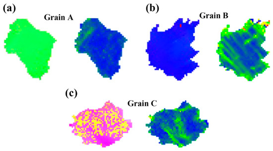 Select Grain A, B and C without twins and the second phase from Alloy A, B and C in Figure 11. IPF image and Kernel average misorientation (KAM) maps of grans: (a) Grain A, (b) Grain B, (c) Grain C.