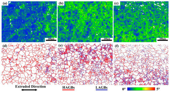 KAM diagram and grain boundary diagram near the alloy fracture, (a,d) Alloy A, (b,e) Alloy B, (c,f) Alloy C.