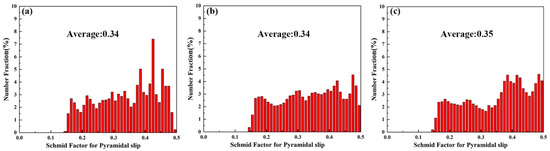 The pyramidal <c + a> slip SF distribution of three alloys, (a) Alloy A, (b) Alloy B, (c) Alloy C.