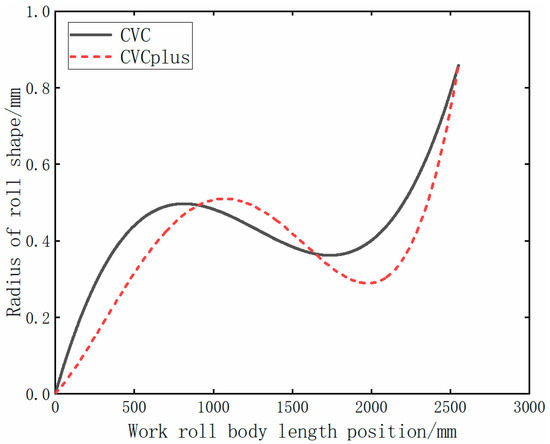 Although the finishing mill is equipped with roll bending and roll shifting, it can only be used to control the low-order shape defects, such as center buckle and edge waves [20,21,22]. The high-order shape defects need to be eliminated in other ways, such as advanced roll shape, which is the most direct, the most flexible, and the most effective shape control method [23,24]. Since the production of high-strength steel faces great changes in material strength and specifications, the continuous variable crown (CVC) roll shape with a cubic curve is usually adopted on the finishing mill stand [25]. The continuous change and free selection of the roll gap crown are then realized by roll shifting [26,27,28]. The curve of CVC roll shape is shown in Figure 2, which shows the shape of the CVC roll and the assembly of a pair of CVC work rolls during operation.
