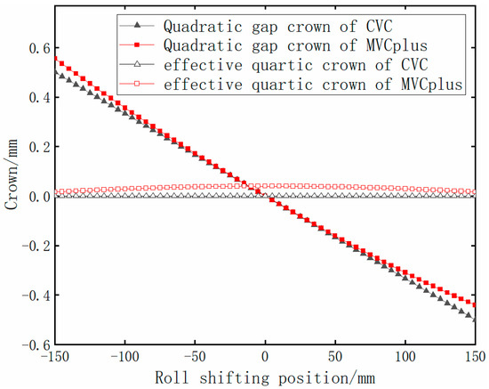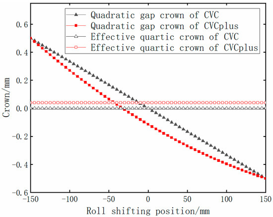 As can be seen from Figure 4, the effective quartic crown keeps constant with the change in the roll shifting position using CVCplus, and the change in the quadratic gap crown with roll shifting is no longer linear. This will affect the control accuracy of crowns, the center buckle, and edge waves. It can be seen from Figure 5 that the roll gap contour of CVCplus is very different from that of CVC at the same roll shifting position, and even has an opposite trend.