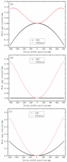 Roll gap contour of MVCplus at different roll shifting positions. (a) Roll shifting −150 mm; (b) roll shifting 0 mm; (c) roll shifting 150 mm.