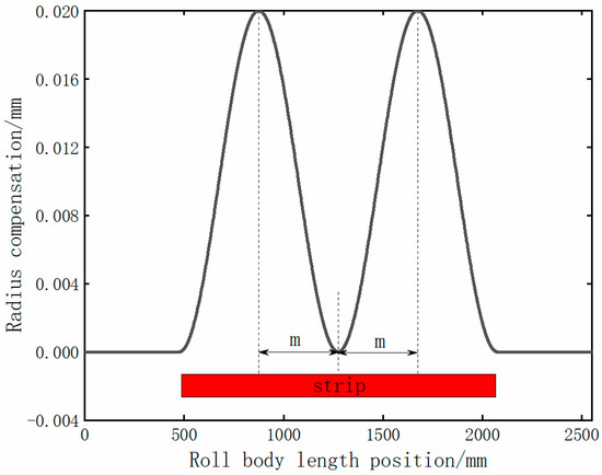 where yt1(x) is the compensation curve; x is the length coordinate of the roll barrel; A is the maximum value of radius compensation; w1 and f1 are, respectively, the angular velocity and phase of the cosine curve at the strip edge, and w2 and f2 are, respectively, the angular velocity and phase of the cosine curve in the middle of the strip. m refers to the distance between the center of the quarter wave and the middle of the strip, L refers to the length of the work roll barrel, and B refers to the strip width where the quarter wave often occurs.