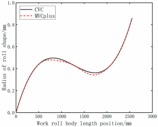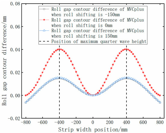 The gap compensation effect can be checked by subtracting the roll gap contour of MVCplus and CVC. It can be seen from Figure 11 that the maximum compensation is located at the position of the maximum quarter wave height, which is in line with the expected effect. MVCplus has little influence on the middle and edge of the base CVC roll shape, and only local corrections are made around the quarter position of the strip, so as to minimize the influence on the profile and flatness of the middle and edge of the strip.