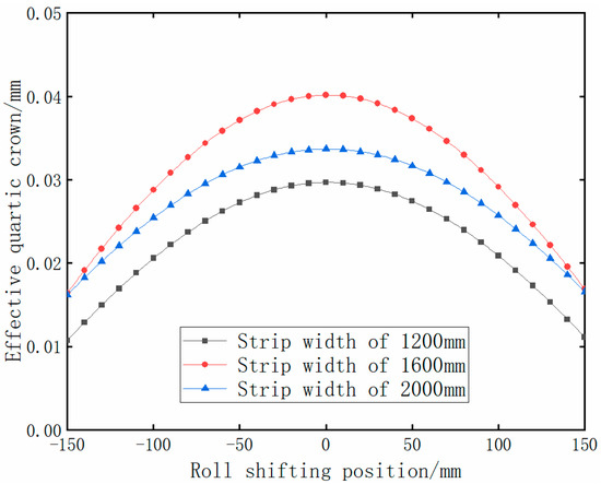 As shown in Figure 14, the effective quartic crown changes parabola with the work roll shifting. When the roll shifting is zero, the adjustment ability of the effective quartic crown reaches the maximum, and the adjustment ability gradually decreases when the work roll moves toward the positive limit or negative limit. Although the ideal effect of “the effective quartic crown keeps a constant value with the change in the roll shifting” is not achieved, this is an acceptable result, because the roll shifting distribution often presents a normal distribution form. The use frequency near zero position of the roll shifting is the highest, and the compensation effect can be optimal at this position.