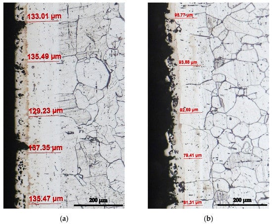 The effects of change in the growth kinetics of the free porous zone with the variation of the holding time with temperature (1150 °C) and the proportion of active component (FeSi75C) from the powdered solid mixture. Etchant: Nital 2%. (a) 1150 °C/5 h; 40% FeSi; 9% NH4Cl (exp. 3); (b) 1150 °C/1 h; 60% FeSi; 9% NH4Cl (exp. 4).
