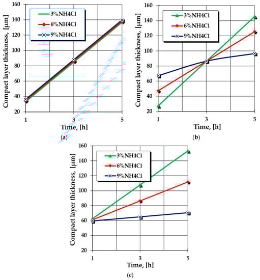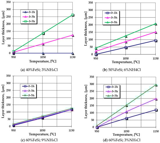- The increase in the proportion of halide, utilized as an activator of the reactions between the components of the powdered solid medium, but also as an activator of the surface of the thermochemically processed metallic product, has a significant effect, especially for high values of the active component of the medium (ferrosilicon), as is shown in Figure 2a,c. Thus, for example, for 60% FeSi75C, the effects of the increase in the proportion of halide between 3 and 9% for a constant holding time on temperature is strictly dependent on the processing temperature—at 3% NH4Cl, the kinetics accelerates when the temperature is higher and the holding time is longer, as is shown in Figure 2d. At 9% NH4Cl, the variation of the holding time does not influence the kinetics, regardless of the processing temperature, as is shown in Figure 2c.