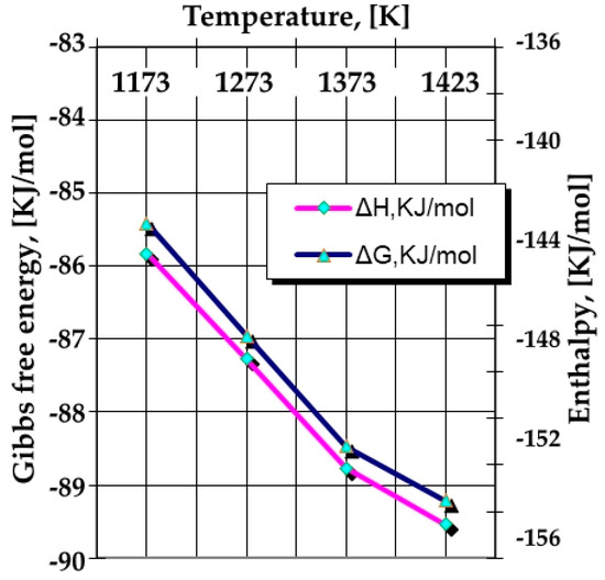 The evolution of the main thermodynamical properties specific to Equation (22) with temperature, was obtained with the help of Outotec’s HSC 6.12 Chemistry Software [].
