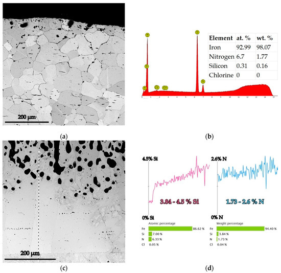 X-ray microanalysis performed using an energy dispersive spectrometer (EDS), in the areas adjacent to the thermochemically processed surfaces, confirms the presence of N alongside the Si adsorbed and diffused in the layer in different concentrations, depending on the temperature and type of active component, as is shown in Figure 5.