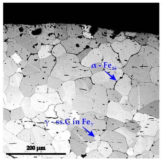 The cited literature [] shows that an increase in the carbon concentration in the superficial areas of the products subjected to silicon cementation is very likely to determine a decrease in the differences between the partial diffusion coefficients of Si in Fe and the reverse, of Fe in Si, and thereby diminish the probability of diffusion porosity occurring (reducing the magnitude of the development of the Kirkendall–Frenkel phenomenon).