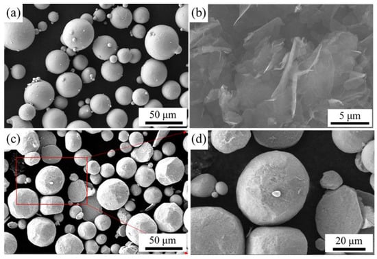 (a) Ti6Al4V powder morphology; (b) graphene morphology; (c,d) morphology of graphene and Ti6Al4V powder after ball milling.