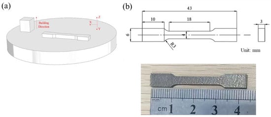 (a) Schematic of building direction; (b) tensile specimen.