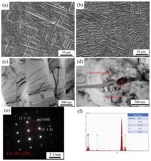 Figure 3 shows the microstructure of the Ti6Al4V alloy and graphene-reinforced Ti6Al4V composite. A large amount of coarse α’ acicular martensite was observed. The α’ acicular martensite was refined, as shown in Figure 3. New nanoparticles were formed in the graphene-reinforced Ti6Al4V composite, as shown in Figure 3d. According to the EDS analysis (Figure 3f), the granular precipitation was mainly composed of Ti and C elements, and the atomic ratio was close to 1:1. Figure 3d shows the TEM micromorphology and selected area electron diffraction (SAED) (Figure 3e) of TiC particles. Previous studies have also verified the existence of graphene [25] and TiC (Figure 4 [26]). In general, the reinforcing phases in the graphene-reinforced Ti6Al4V composite are graphene and TiC particles.