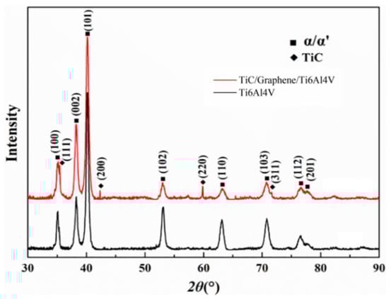 XRD patterns of the TiC/graphene/Ti6Al4V composite and Ti6Al4V alloy. Reprinted with permission from Ref. [26]. 2023, Elsevier.