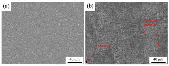 Figure 5 shows the micro morphologies of the Ti6Al4V alloy and composite at a lower magnification under SEM, where no pores were observed, while a small number of pores with a diameter of 5 μ m were observed in the composite. The density of the Ti6Al4V alloy was 99.2%, and that of the TiC/graphene/Ti6Al4V composite was 98.9%. Therefore, the porosity of the formed composite material was more than that of the Ti6Al4V alloy; however, a density above 98% had little influence on its mechanical properties [27]. Therefore, the influence of porosity on the formation of voids during tension is lower.