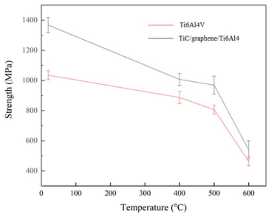 Figure 6 shows the engineering tensile strength of the LPBF-formed Ti6Al4V and TiC/graphene/Ti6Al4V composite at 400 °C, 500 °C, and 600 °C. At 400 °C, the tensile strengths of the Ti6Al4V alloy and composite were 880 MPa and 1006 MPa, respectively, which was 126 MPa higher than that of the Ti6Al4V alloy. At 500 °C, the tensile strengths of the Ti6Al4V alloy and composite were 806 MPa and 162 MPa higher than that of the Ti6Al4V alloy, respectively. At 600 °C, the tensile strengths of the Ti6Al4V alloy and composite were 462 MPa and 76 MPa higher than that of the Ti6Al4V alloy, respectively.
