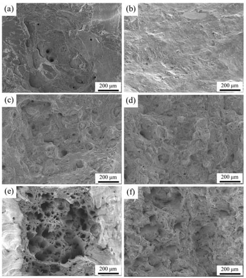 Fracture morphologies at different temperatures: (a,c,e) fracture morphologies of Ti6Al4V alloys at 400 °C, 500 °C, and 600 °C; (b,d,f) fracture morphologies of TiC/graphene/Ti6Al4V composite at 400 °C, 500 °C, and 600 °C.