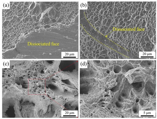 The high-temperature tensile fracture image of the Ti6Al4V alloy: (a) Fracture morphology at 400 °C; (b) fracture morphology at 500 °C; (c,d) Fracture morphology at 600 °C.
