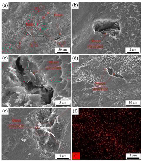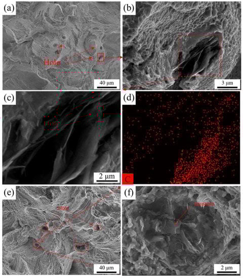 The fracture shape of the TiC/graphene/Ti6Al4V composite at 400 °C is shown in Figure 9a. Large cracks and a large number of dissociation surfaces are visible. The large cracks revealed a ‘u’ shape; at the same time, the sheet structure in the hole shown in Figure 9b–e, enlarged sheet structure of Figure 9e, and EDS surface sweep elemental analysis showed that the lamellar structure consisted of carbon elements as shown in Figure 9f. Therefore, the lamellar structure is unreacted graphene. The fracture morphology on both sides of the hole was different: one side was the dissociation surface, and the other side was the dimple (the average size of statistical dimples is 1.1 μm), as shown in Figure 9b. The fracture morphology of the TiC/graphene/Ti6Al4V composite at 500 °C shows a large number of dimples (average size of 0.97 μm) and a small amount of dissociation surface, while the dimple size of the TiC/graphene/Ti6Al4V composite is significantly reduced, and the dissociation surface is smaller than that of the Ti6Al4V alloy. The same sheet structure as that shown in Figure 9 existed in the holes, as shown in Figure 10c, and the composite of the sheet structure was carbon, as confirmed by an EDS surface scanning analysis. Therefore, this sheet structure was unreacted graphene in the composite. The fracture morphology of the TiC/graphene/Ti6Al4V composite at 600 °C was also the same as that of the Ti6Al4V alloy in Figure 10f, and the number and size of the pores were much smaller than those of the Ti6Al4V alloy, evidenced by the statistical dimple size average of 0.54 μm.