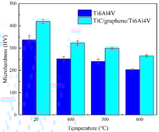 The microhardness of the Ti6Al4V alloy and TiC/graphene/Ti6Al4V composite formed by LPBF at room temperature and high temperatures is shown in Figure 11. The hardness of the two materials decreased step by step at high temperatures. The microhardness of the Ti6Al4V alloy at room temperature was 336 HV, and that formed by electron beam was 340 HV [32], whereas the microhardness of the TiC/graphene/Ti6Al4V composite was 419 HV, which was 83 HV higher than the LPBF-formed Ti6Al4V alloy and 79 HV higher than the Ti6Al4V alloy formed by the electron beam. The micro-hardness of the TiC/graphene/Ti6Al4V composite at 400 °C, 500 °C, and 600 °C was 70 HV, 59 HV, and 61 HV higher than that of the TiC/graphene/Ti6Al4V composite, respectively. The microhardness of the TiC/graphene/Ti6Al4V composite at 600 °C was higher than that of the Ti6Al4V alloy at 400 °C, indicating that the working temperature of the TiC/graphene/Ti6Al4V composite could be higher than that of the Ti6Al4V alloy. The hardness of the TiC/graphene/Ti6Al4V composite could be improved by the grain size refinement of the composite and dispersion strengthening mechanism of the TiC particles and graphene.
