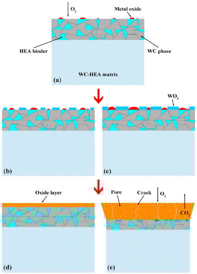 The schematic diagram of the oxidation process for the WC-HEA: (a) selective oxidation of the HEA binder phase; (b,c) simultaneous oxidation of the HEA and the WC phases; and (d,e) growth of the oxide layer accompanied by swelling. Reprinted with permission from Ref. [63]. Copyright 2021 Elsevier.