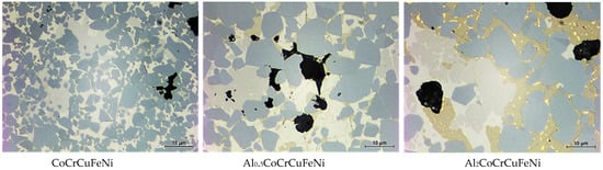 Microstructures of cemented carbides with the CoCrCuFeNi, Al0.5CoCrCuFeNi and Al2CoCrCuFeNi HEA binders sintered at 1500 °C in a vacuum for 2 h. Reprinted with permission from Ref. [61]. Copyright 2019 Elsevier.
