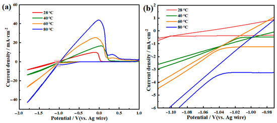 The electrochemical behavior of the DES electrolyte at different temperatures was studied by cyclic voltammetry (Figure 1). According to the characteristics of the four curves in Figure 1a, we regarded room temperature and 40 °C as low temperatures, while 60 °C and 80 °C as high temperatures. The two cyclic voltammetry curves obtained at low temperature both had only one oxidation peak, located at −0.11 V (28 °C) and 0.05 V (40 °C), respectively. However, the other two cyclic voltammetry curves of the electrolyte measured at high temperature had two oxidation peaks. The first peaks were located at −0.1 V (60 °C) and −0.08 V (80 °C), respectively, and the second peaks were both located around 0.33 V. The difference in the number of oxidation peaks indicates that the electrolyte will show different characteristics at different temperatures. According to A.P. Abbott’s experimental results [29], two stripping peaks could be observed in the anodic portions of the voltammogram of the EG-based liquid. In contrast, only a single stripping peak could be observed in the voltammogram of the urea-based liquid. Therefore, at low temperature, the electrolyte shows the characteristics of a urea-based liquid. At high temperature, the electrolyte showed the characteristics of an EG-based liquid.