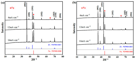 XRD patterns of the as-deposited zinc coating at low temperature (28 °C) and high temperature (60 °C) are displayed in Figure 2a,b, respectively. The diffraction peaks at 44.7° and 65.0° correspond to the substrate Fe.